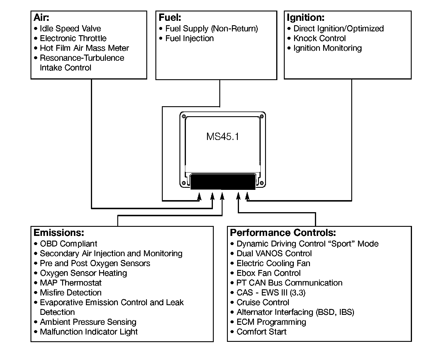 The MS45.1 system is a further enhancement of the MS45 system currently used on M54 engines and manages the following functions: See Fig. 1