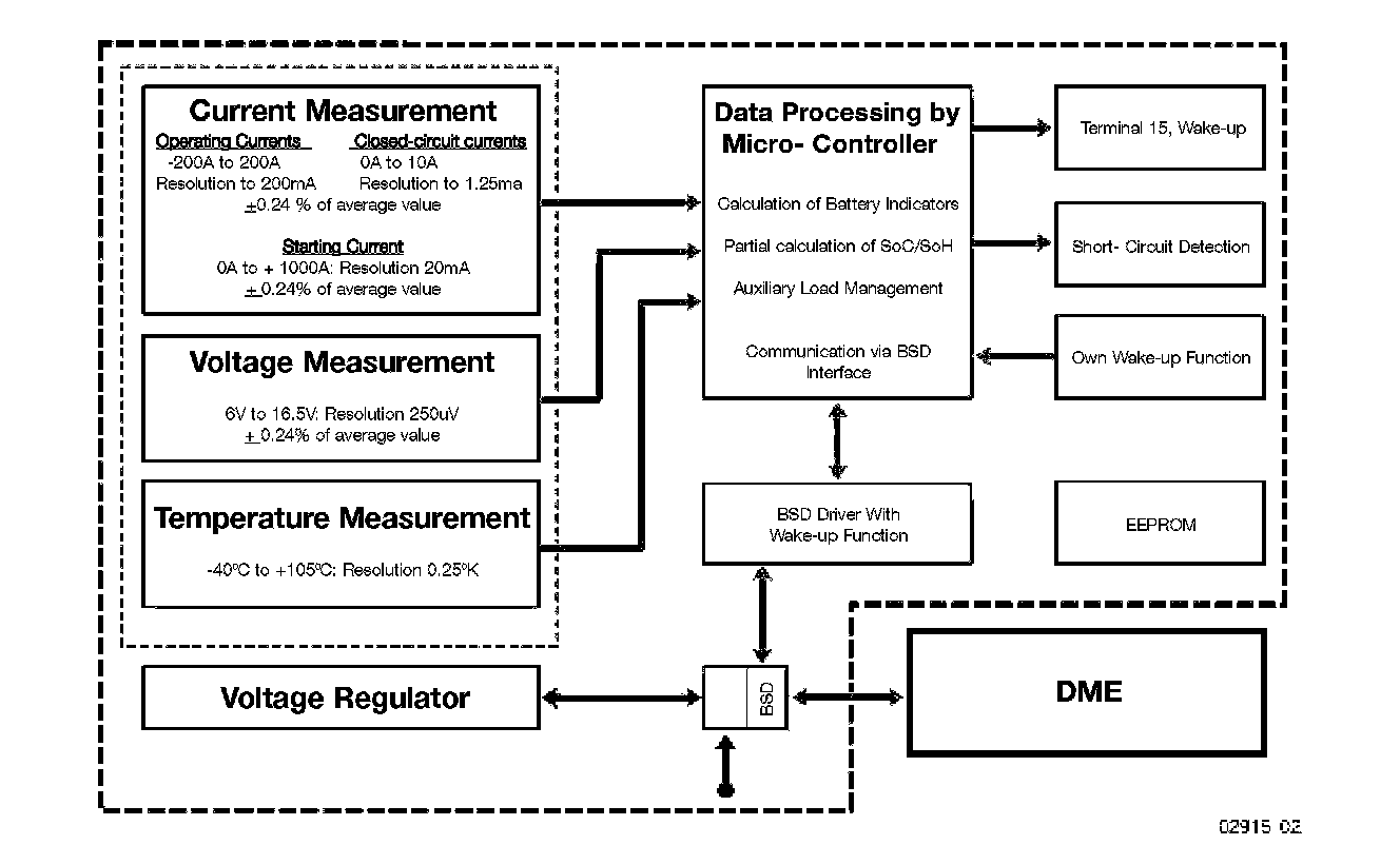 The IBS sends the calculated battery indicators to the DME via the BSD. The IBS calculates changes in battery SoC (state of charge)/SoH (state of health) based on information received from the DME on the SoC (state of charge) of the battery during the period of time between engine OFF and deactivation of the DME relay. After the DME relay has been switched off, the IBS continues to constantly observe the SoC (state of charge) of the battery.