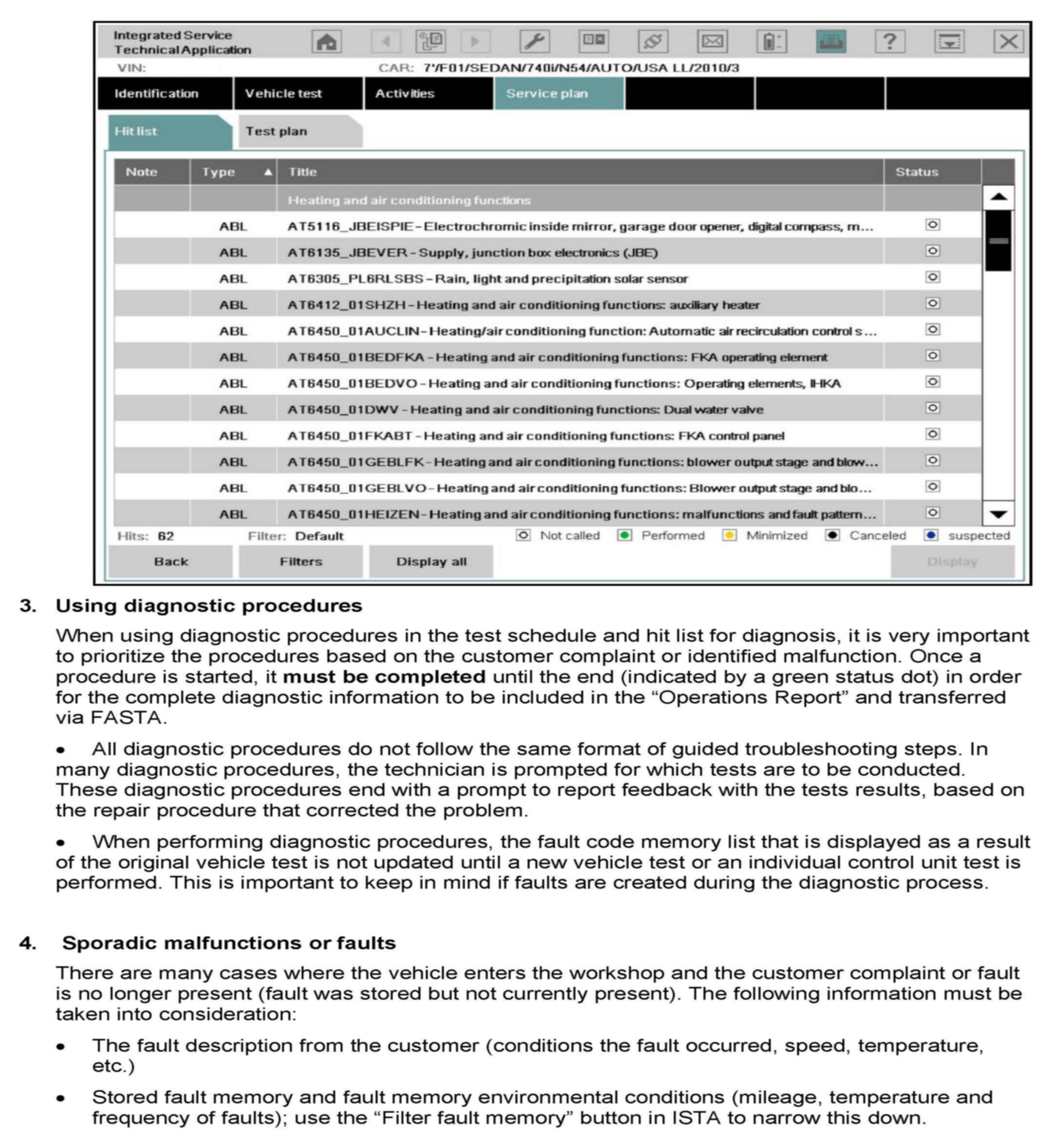 Information and test plans in ISTA (Integrated Service Technical Application) are provided to assist the technician in troubleshooting. Diagnostic test plans are available for electrical and electromechanical vehicle systems, as well as selected mechanical systems (NED; Non-electric Diagnosis). Some electrical components and electromechanical systems do not require test plans to be performed for reimbursement via warranty.