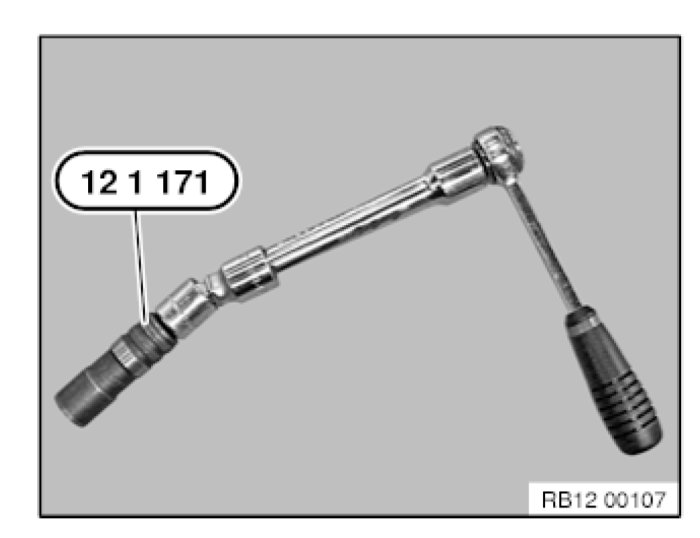 - Next, tighten the spark plugs with a torque wrench, special tool 12 1 171 and an extension with joint.