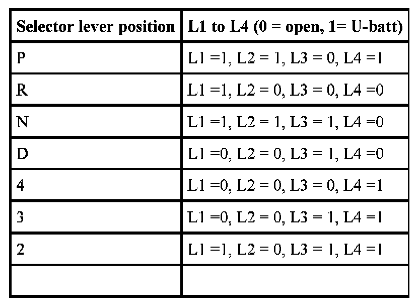 The AGS control unit detects the selector lever position by way of a switch on the transmission. This switch converts the current selector lever position into a code. This selector lever code is transferred via four lines (L1-L4) to the AGS control unit.