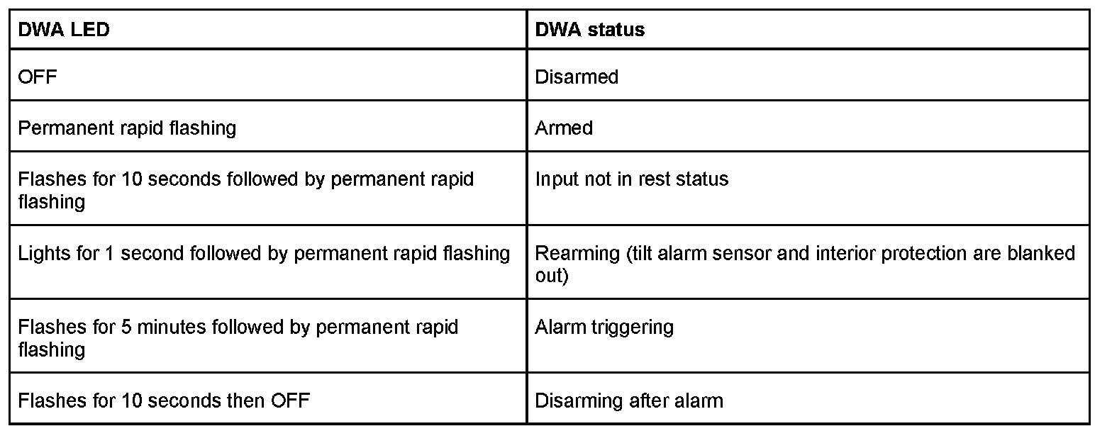 - Unlock driver's door mechanically and open. An alarm is triggered, the DWA LED flashes.