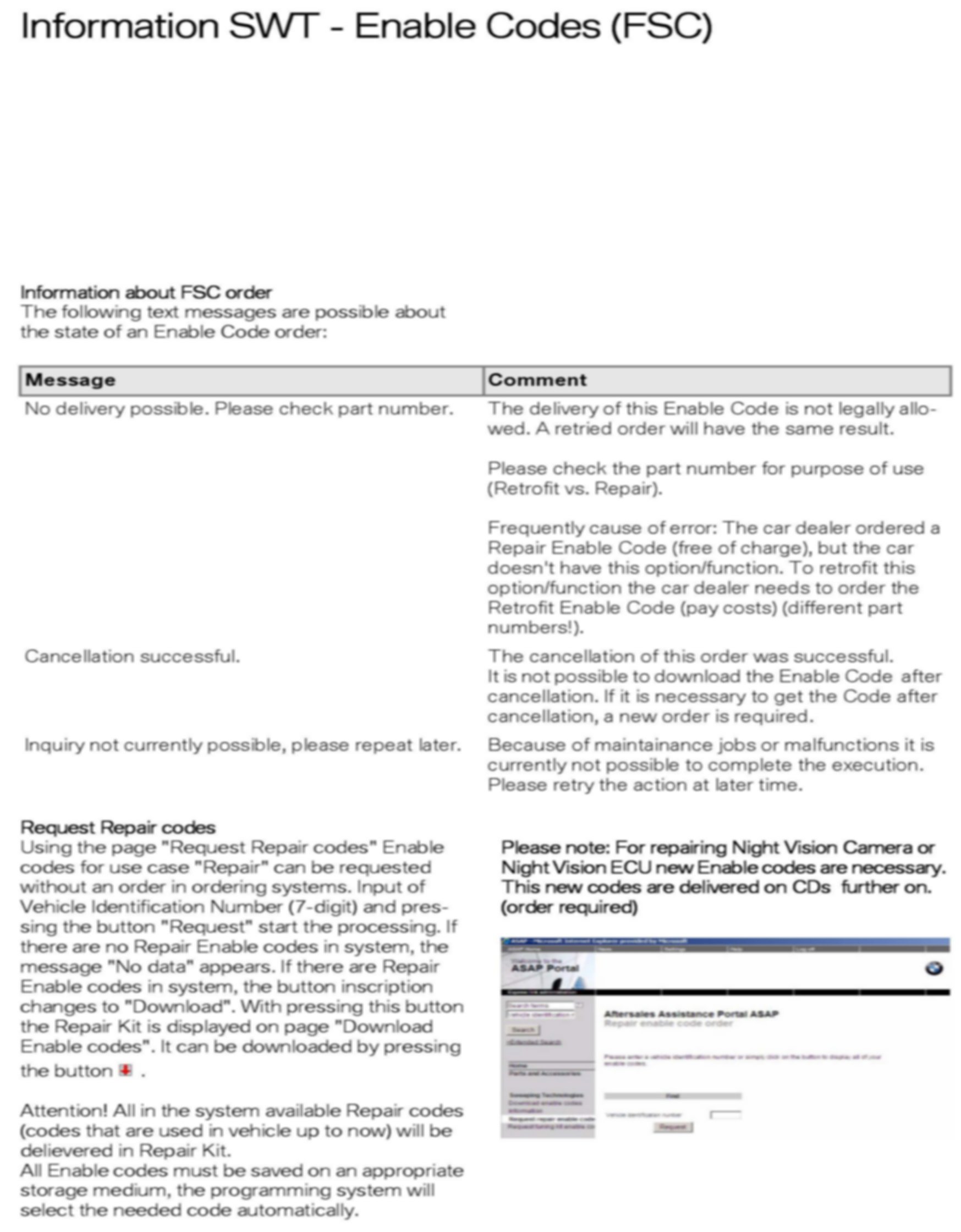 With the introduction of the Night Vision System in March 2006, Enabling Codes were first used in a BMW vehicle to activate the components (Camera and control module) in the vehicle. These codes are the result of a legal requirement, because of strict conditions applying to the use of this Night Vision technology. With Enabling Codes, BMW could ensure that the system can only be used in the registered vehicle.