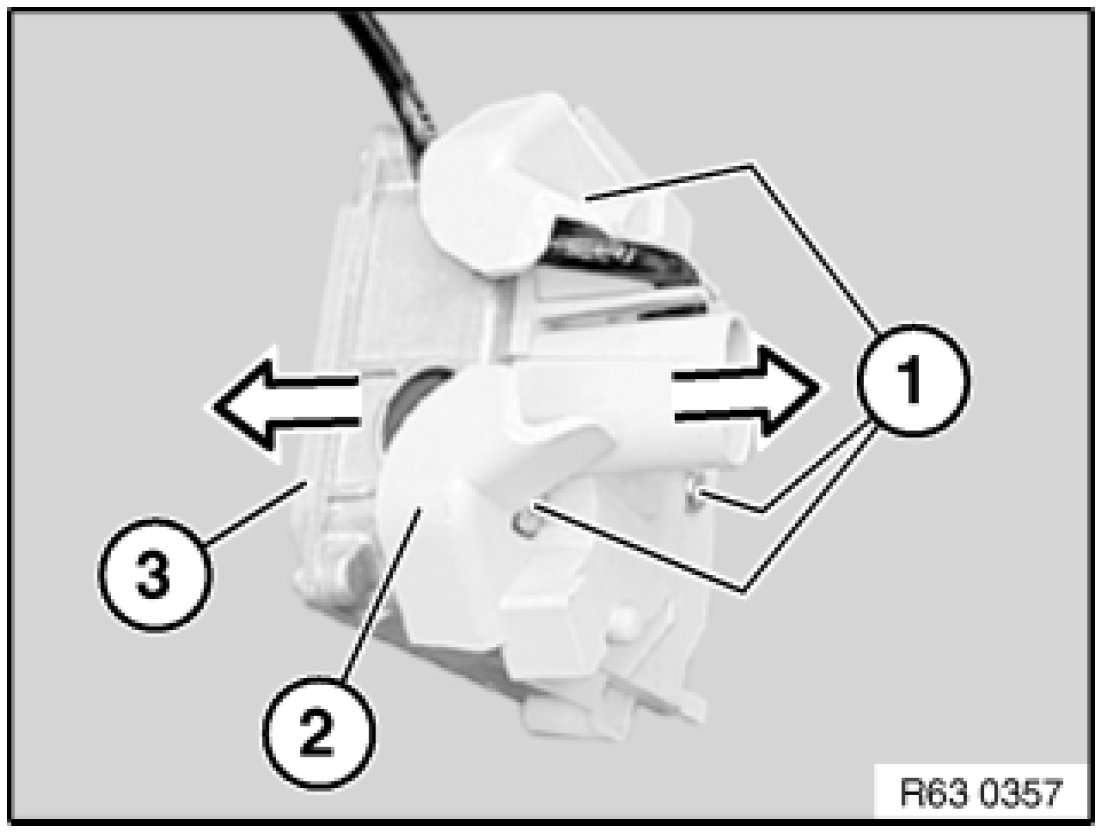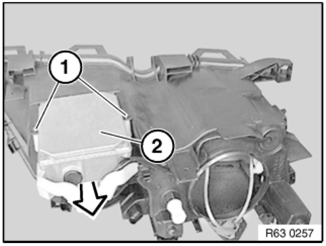 Pull xenon headlight control unit holder together with control unit for xenon headlight (2) in direction of arrow out of guides and place to one side.