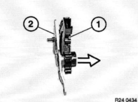 Bore holes for spring pin in transmission switch (1) must overlap with bore holes of detent disk (2) and manual shift valve shaft.