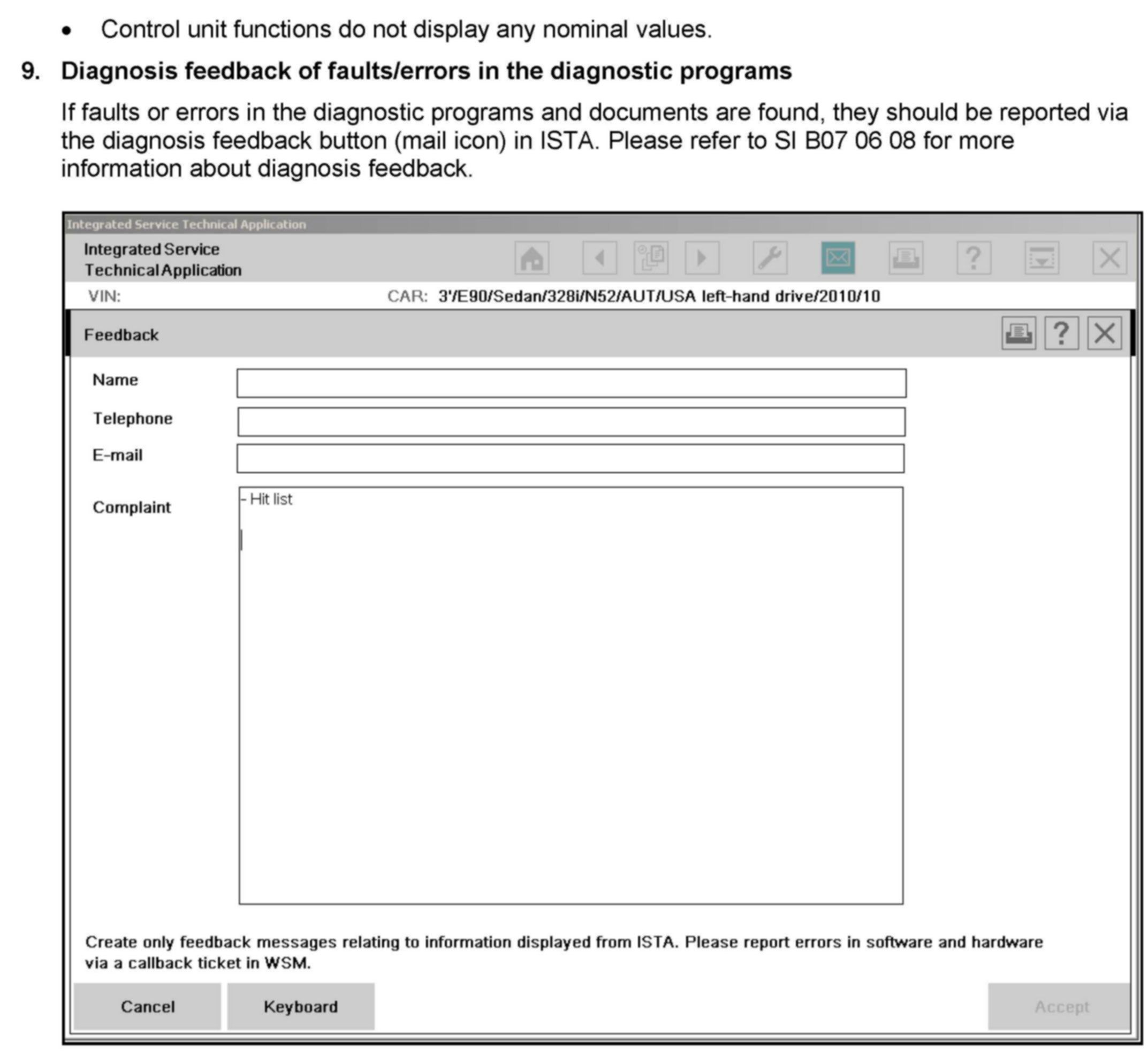 ^ Mechanical systems requiring diagnosis (NED): ISTA document "Contents Non-electric Diagnosis (NED)".