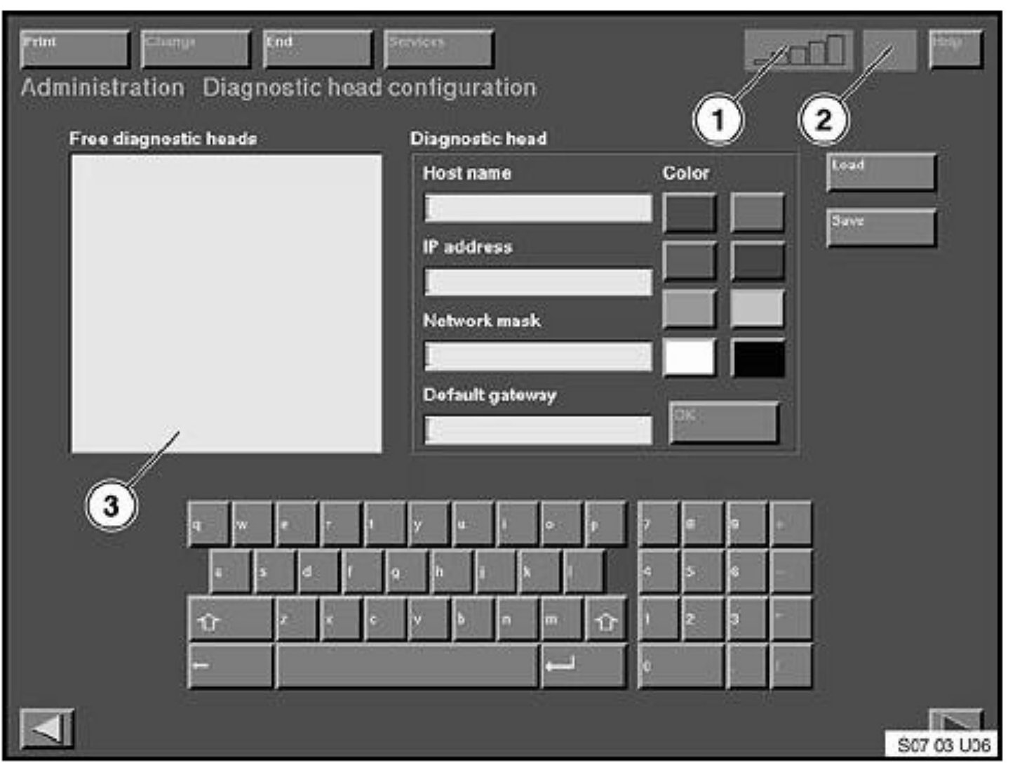 3. This screen is used to assign the network addresses and designation colors to the diagnostic heads. As before, the free diagnostic head appears in the "Free diagnostic heads" box. After physically touching the free head in box 3, the current name and IP's are transferred into the "Diagnostic Head" box to the right. This is where any changes are made. Changes must be saved with the "OK" button.