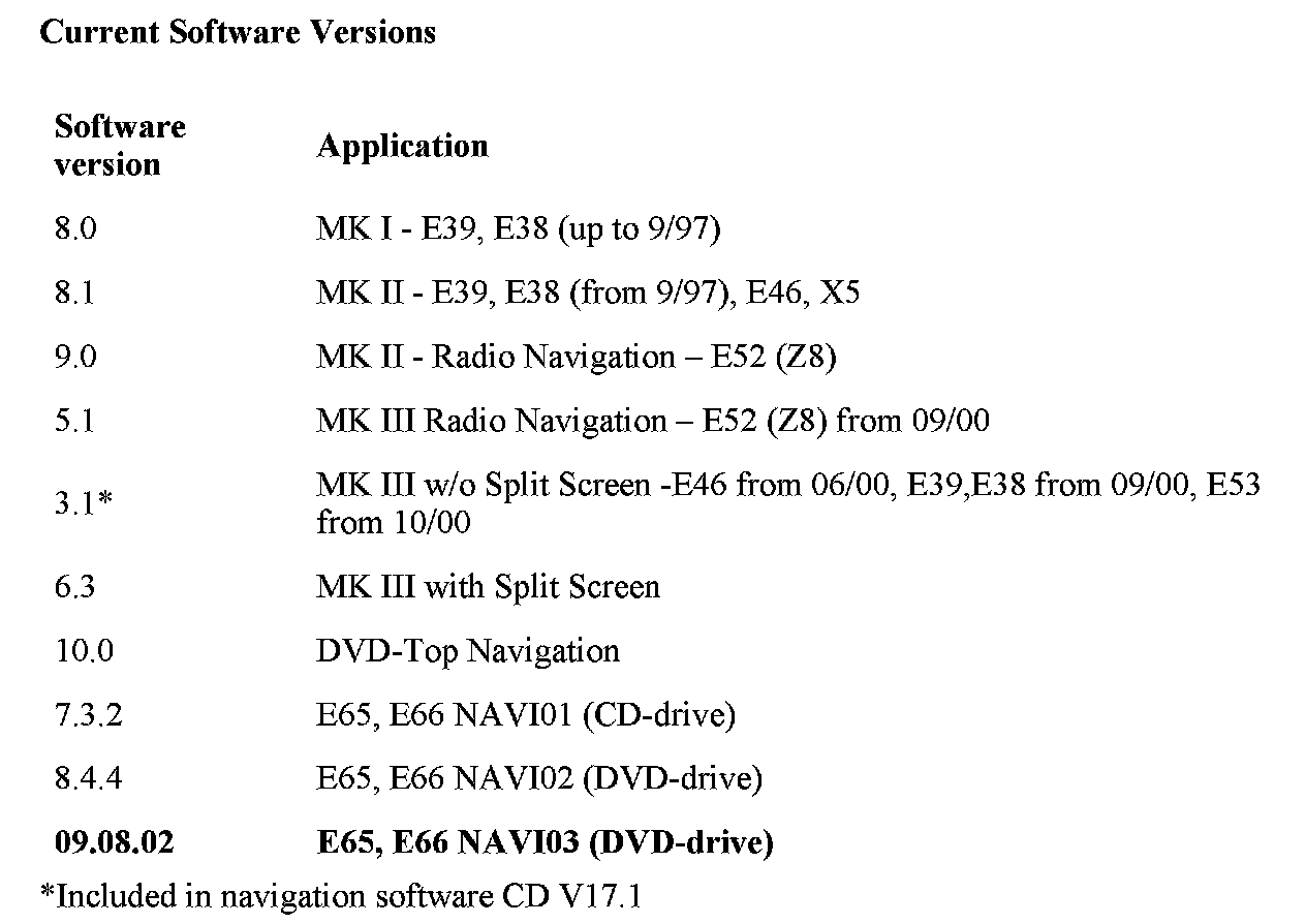 2. Navigation system operating software V32 is used on MK I, MK II, MK III navigation systems with split screen, DVD-Top navigation systems (MK IV) on I-Bus vehicles and NAVI01, NAVI02, NAVI03 on E65/E66 vehicles.