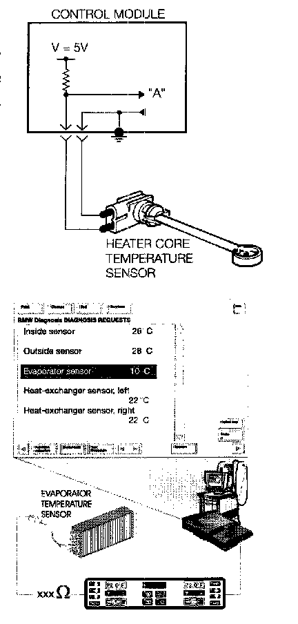 Several different temperature sensors provide inputs to the climate control module. These Negative Temperature Coefficient (NTC) are resistors which are sensitive to changes in temperature.