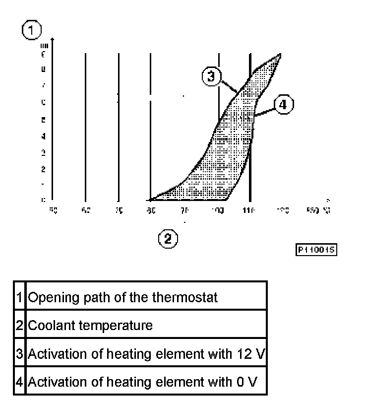 The characteristic map thermostat is designed such that it opens (engine inlet) at a coolant temperature at the thermostat of 103 degree C without intervention of the integrated heating system. Due to the coolant heating up in the engine, a temperature of approx. 110 degree C is measured at the point the coolant flows out of the engine (installation location of coolant temperature sensor for DME and instrument cluster gauge). This is the operating temperature of the engine, at which the characteristic map thermostat begins to open without control intervention.