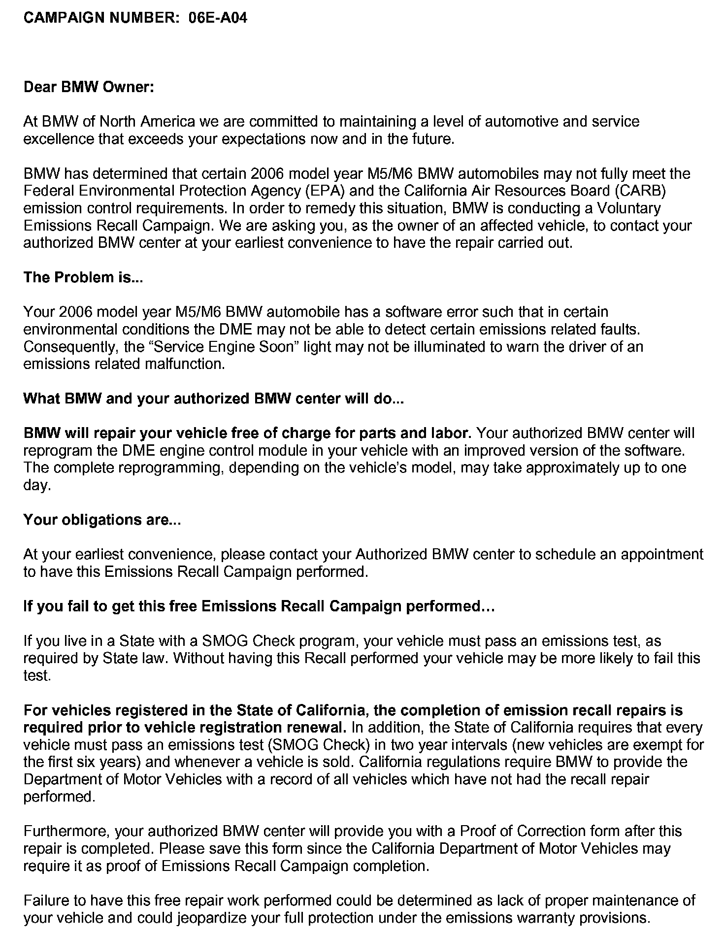Recall 06E-A04 - Reprogram DME for OBD Function