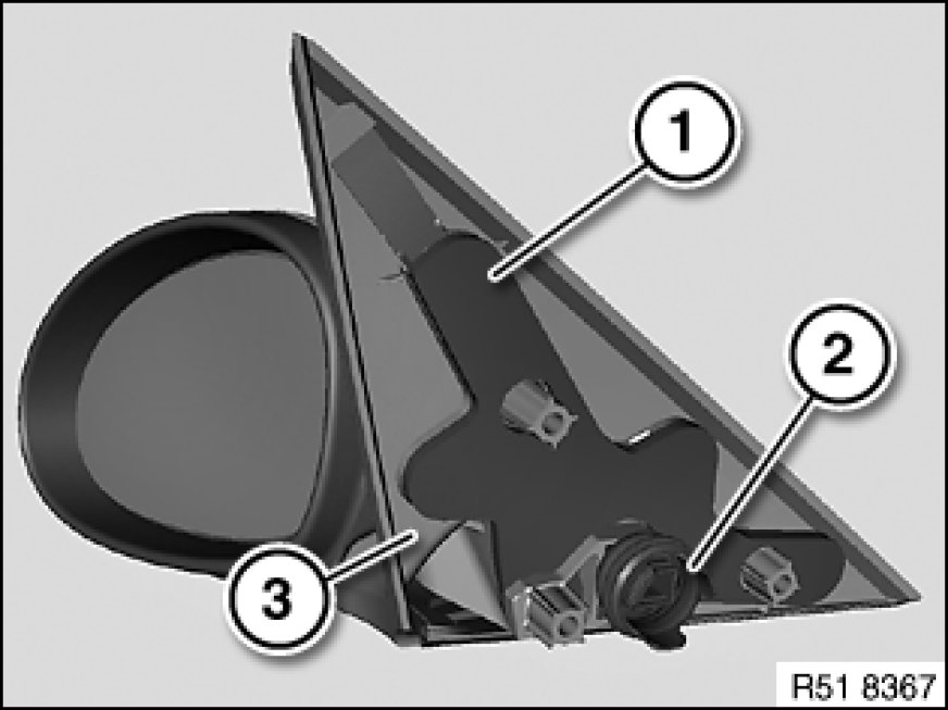 Seals (1 and 2) at the rear-view mirror (3) must not be omitted or damaged.