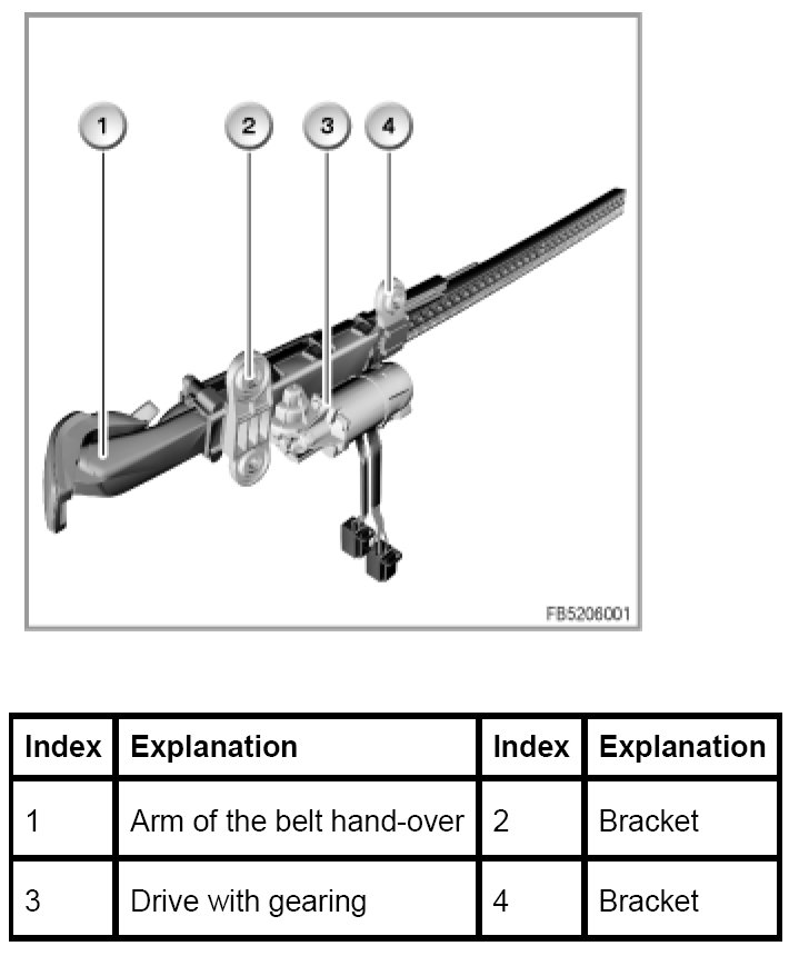 When retracted, the belt hand-over is integrated in the side trim panel and invisible. It fits harmoniously into the design of the passenger compartment. The belt hand-over consists of the following components: