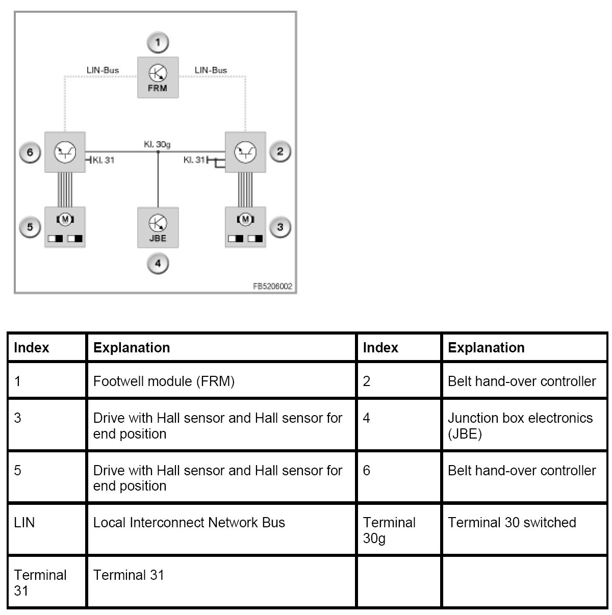 The footwell module (FRM) activates the two belt hand-over controllers for the driver's and passenger's side. The belt hand-over controllers are connected across an LIN bus on the footwell module. The software for activation is in the footwell module.
