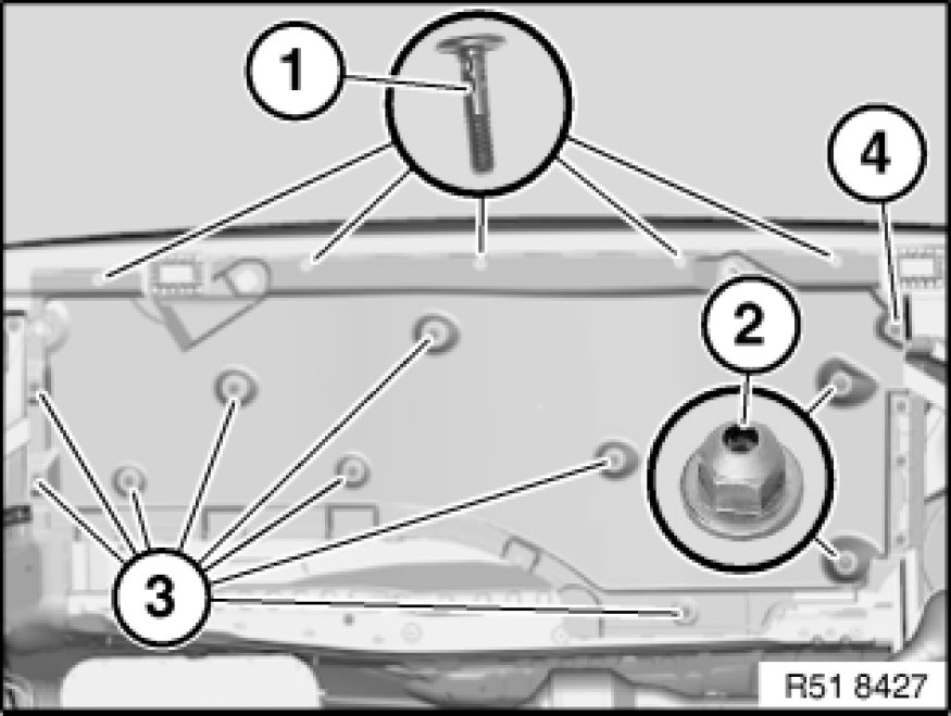 If necessary, replace faulty clips (1) and plastic nuts (2).