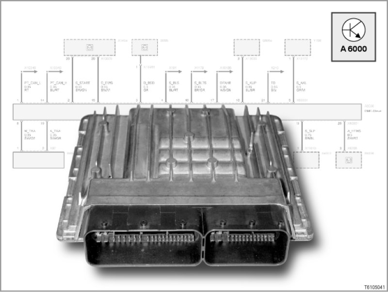 The illustration shows the DME control unit "A6000" for the engine N52 in the E90. (DME: digital engine electronics). In the background is the circuit diagram for this abbreviated designation.