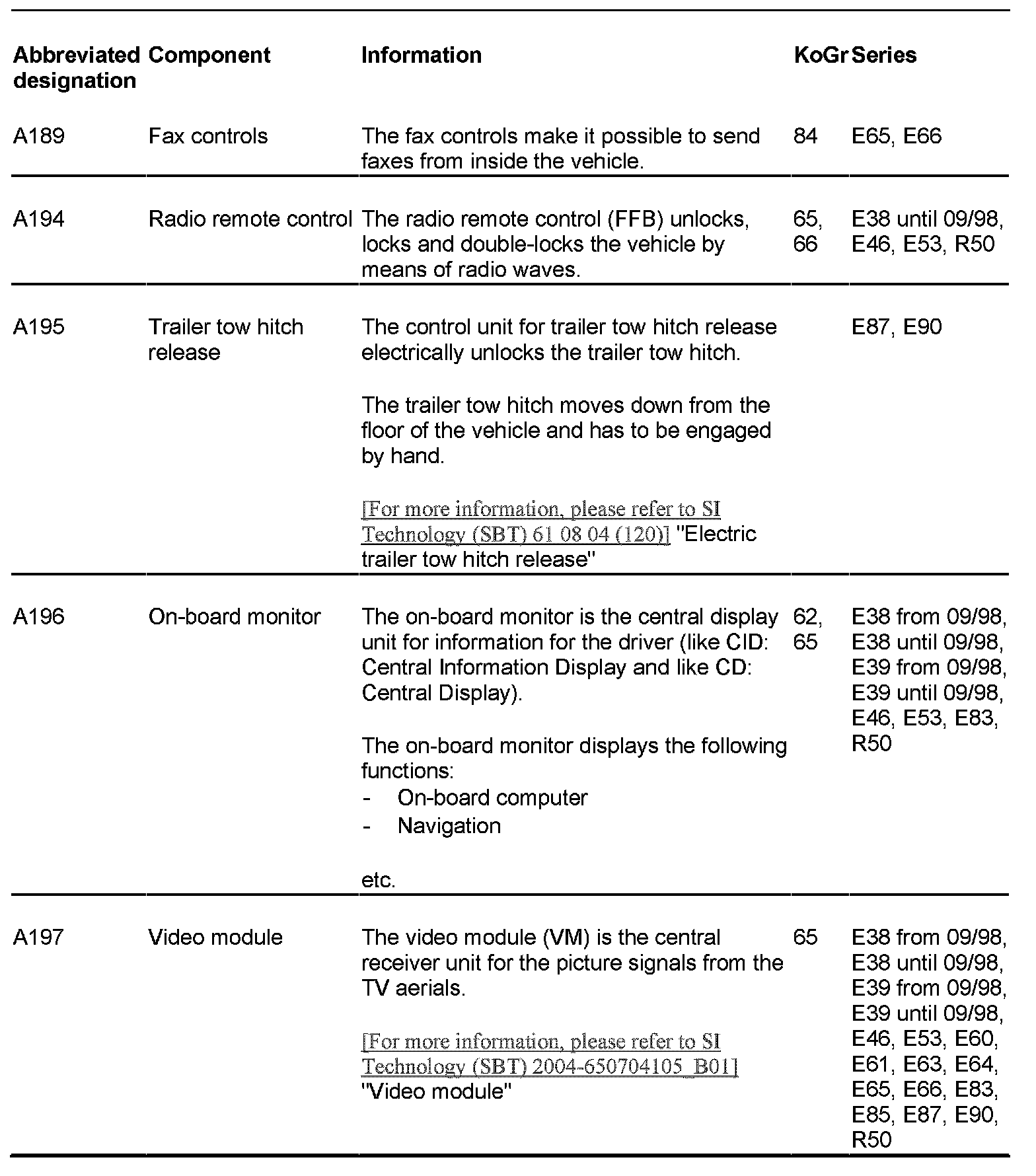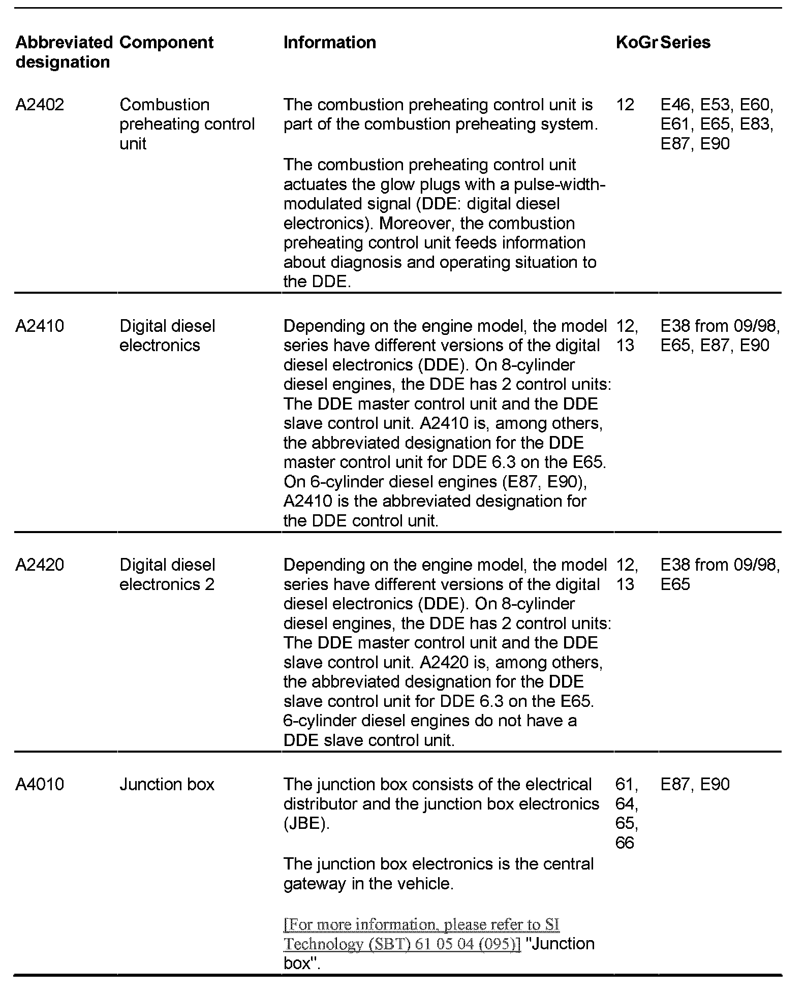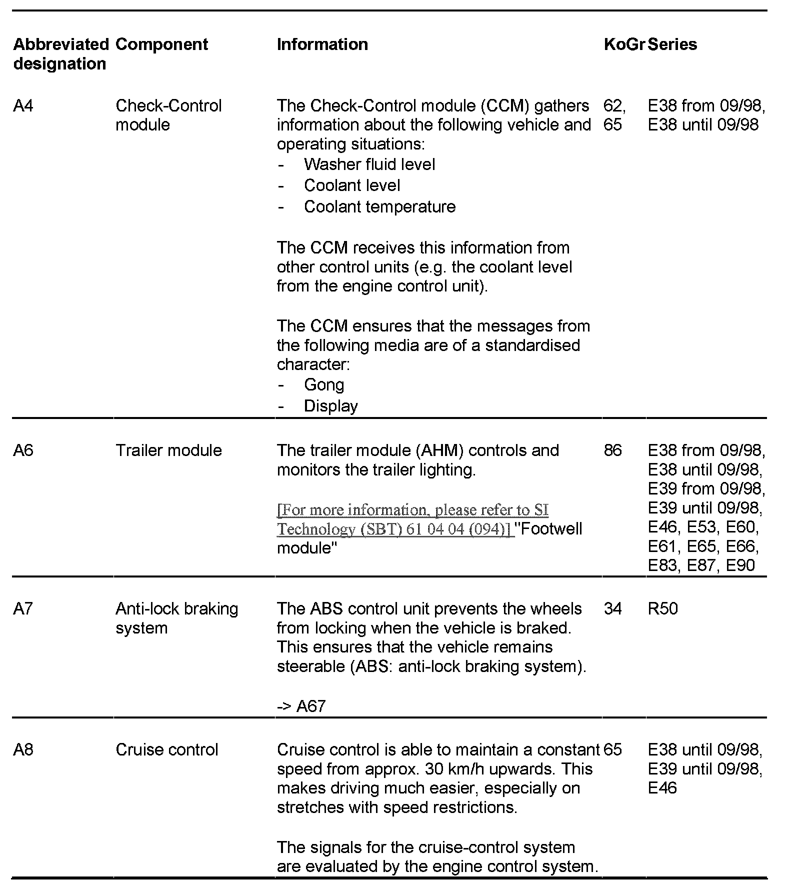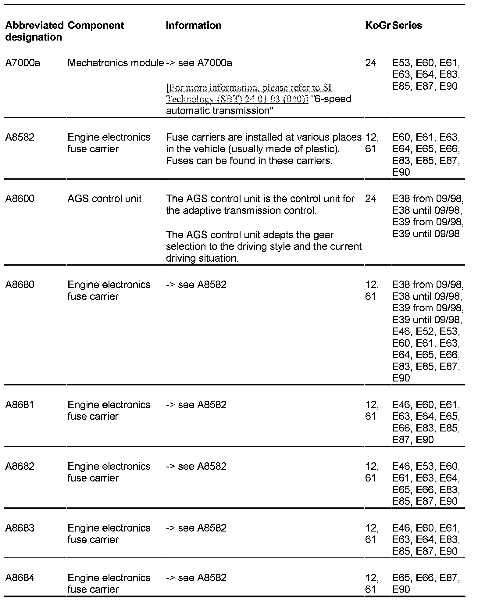 Control units with an abbreviation can be found in the quick test in the BMW diagnosis system and in Progman. These abbreviations can be found in the column headed "Information" in the table below.