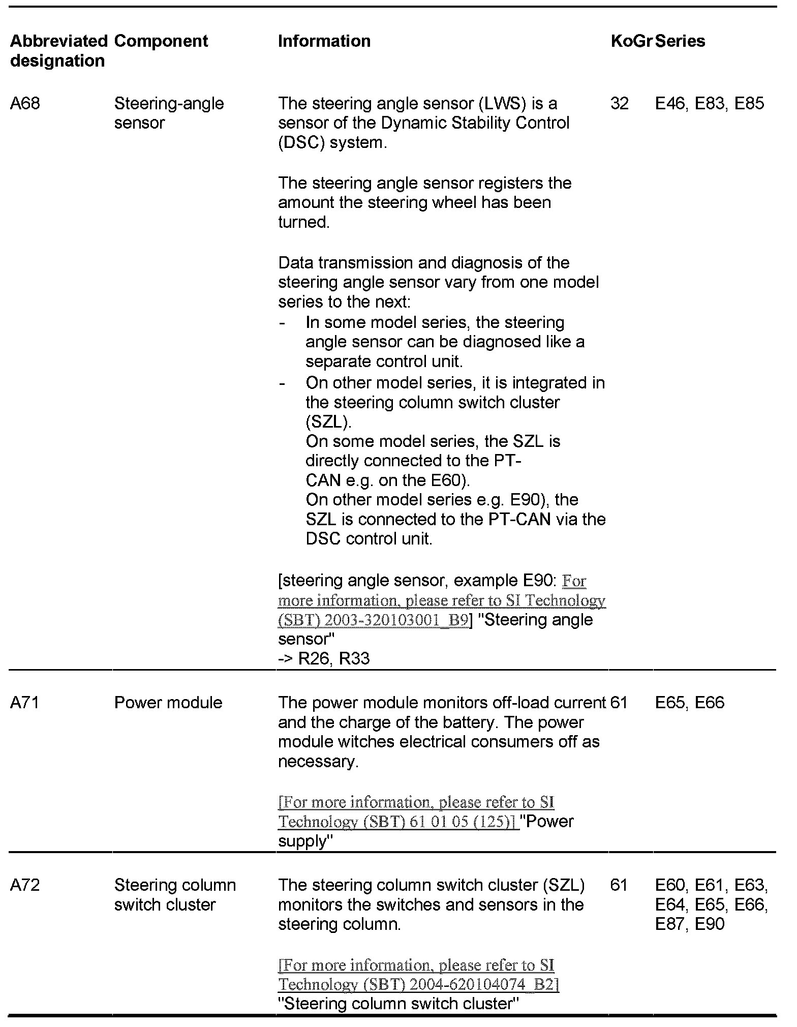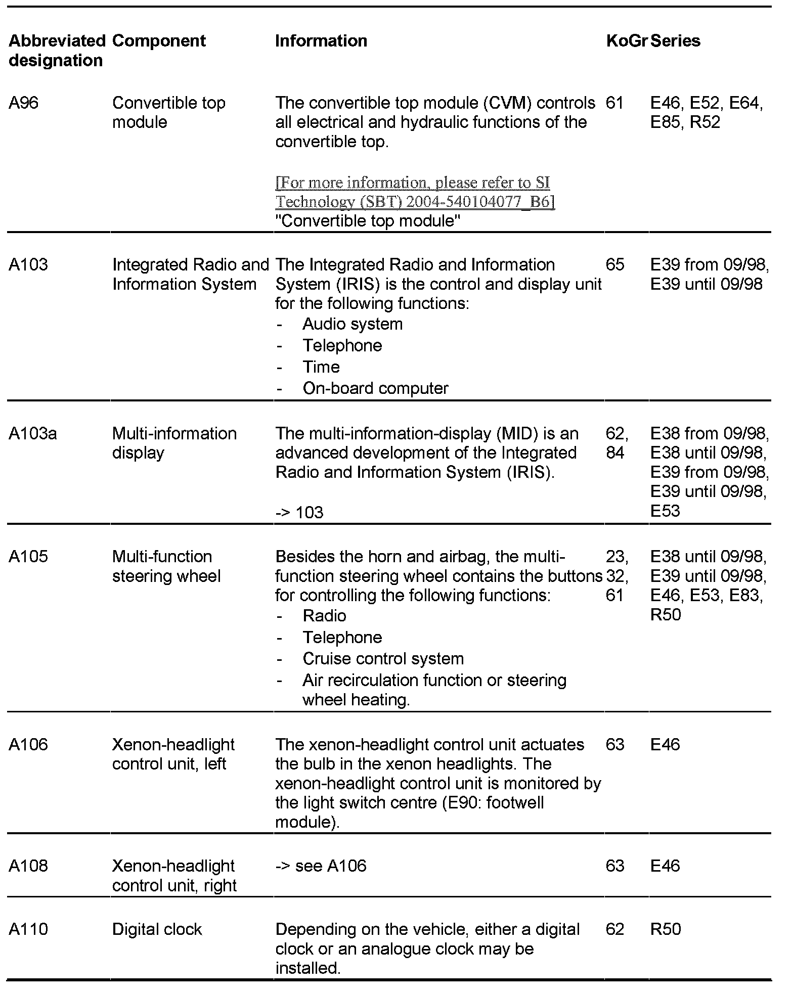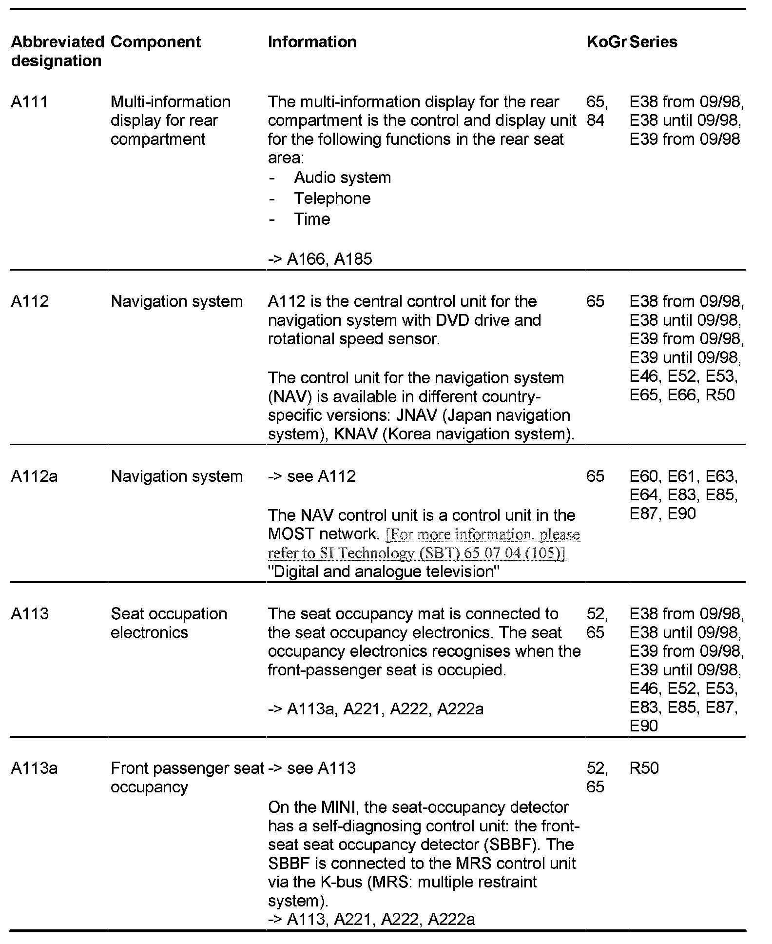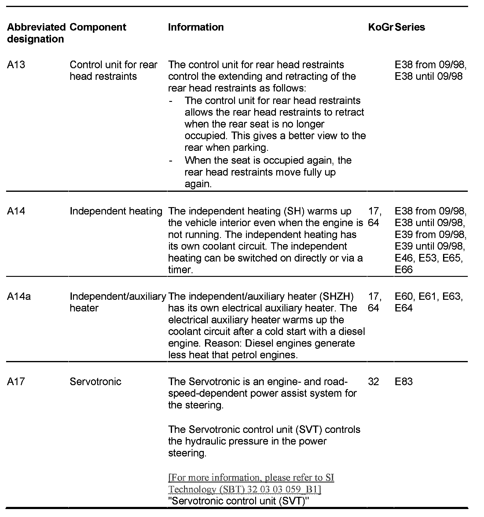 Control units with an abbreviation can be found in the quick test in the BMW diagnosis system and in Progman. These abbreviations can be found in the column headed "Information" in the table below.
