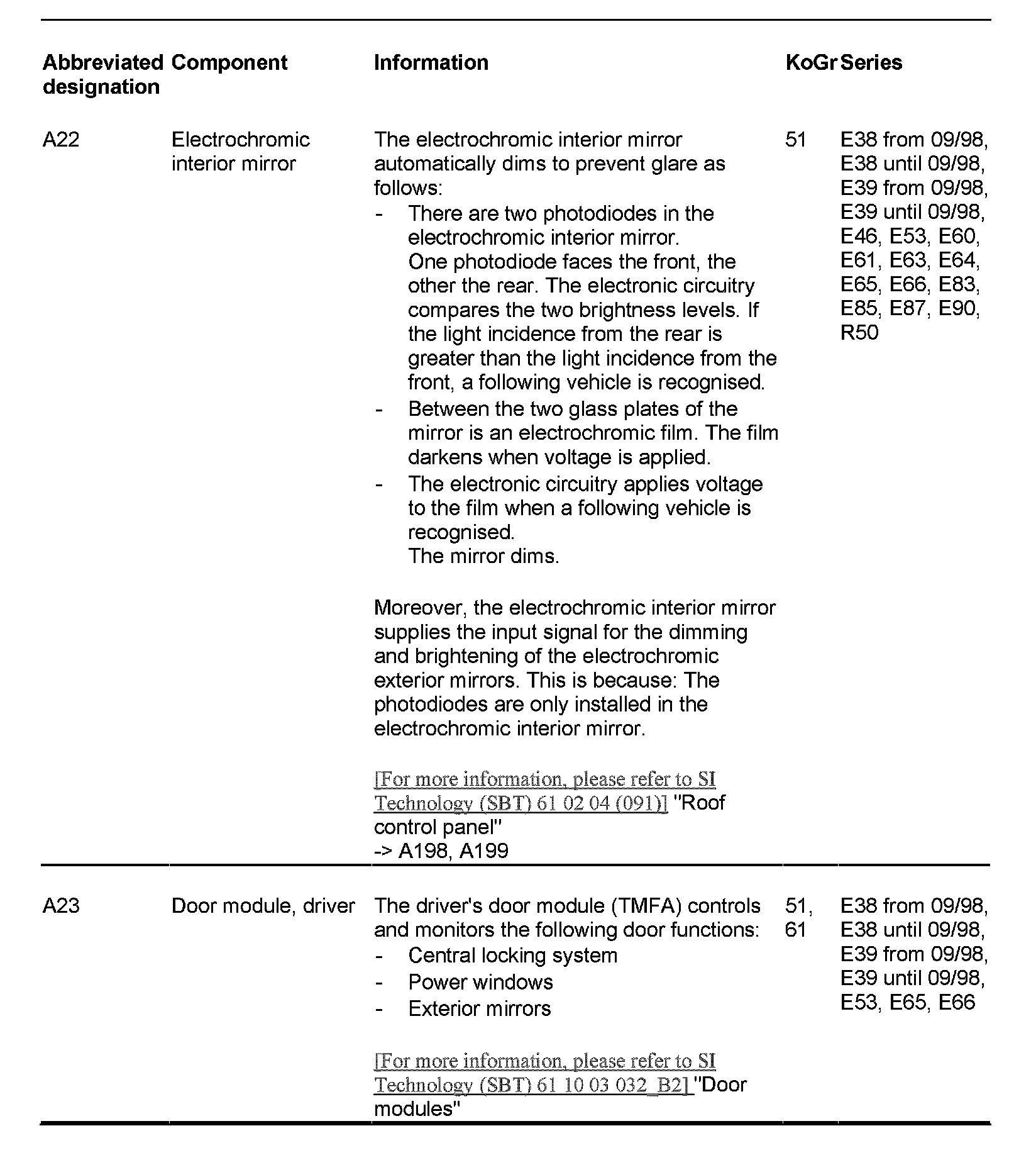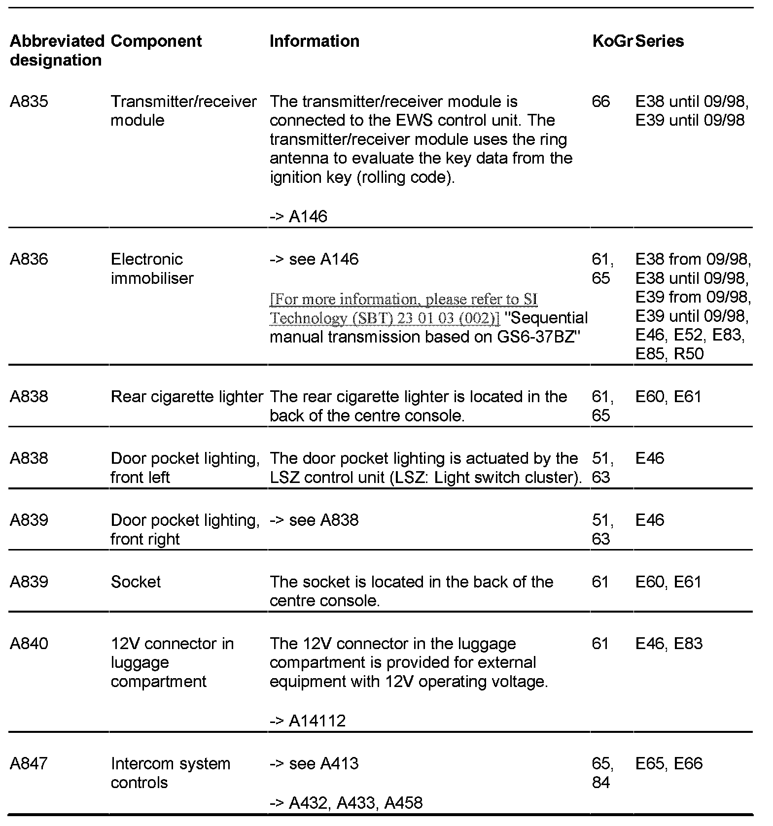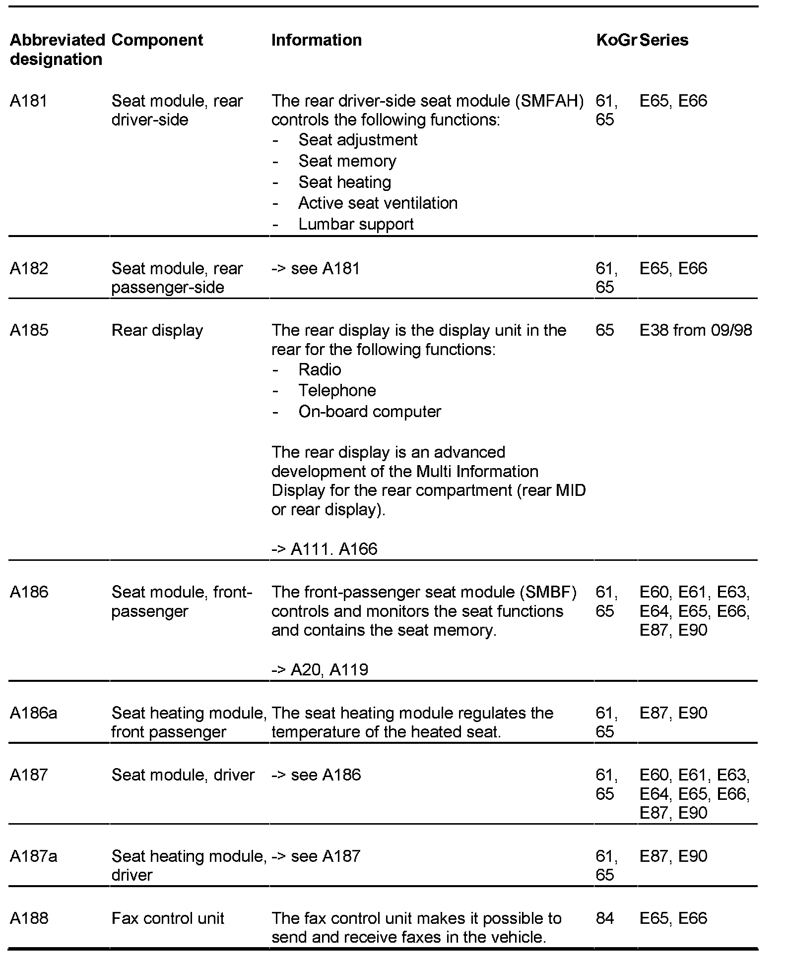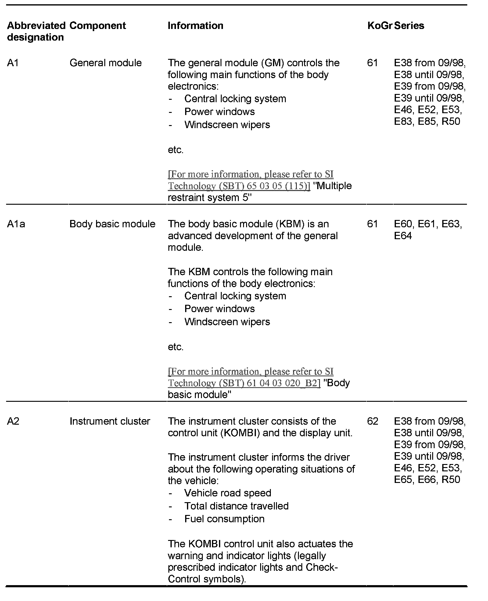 Control units with an abbreviation can be found in the quick test in the BMW diagnosis system and in Progman. These abbreviations can be found in the column headed "Information" in the table below.