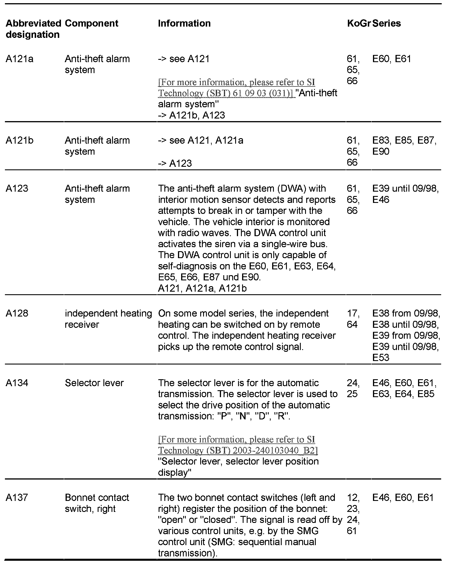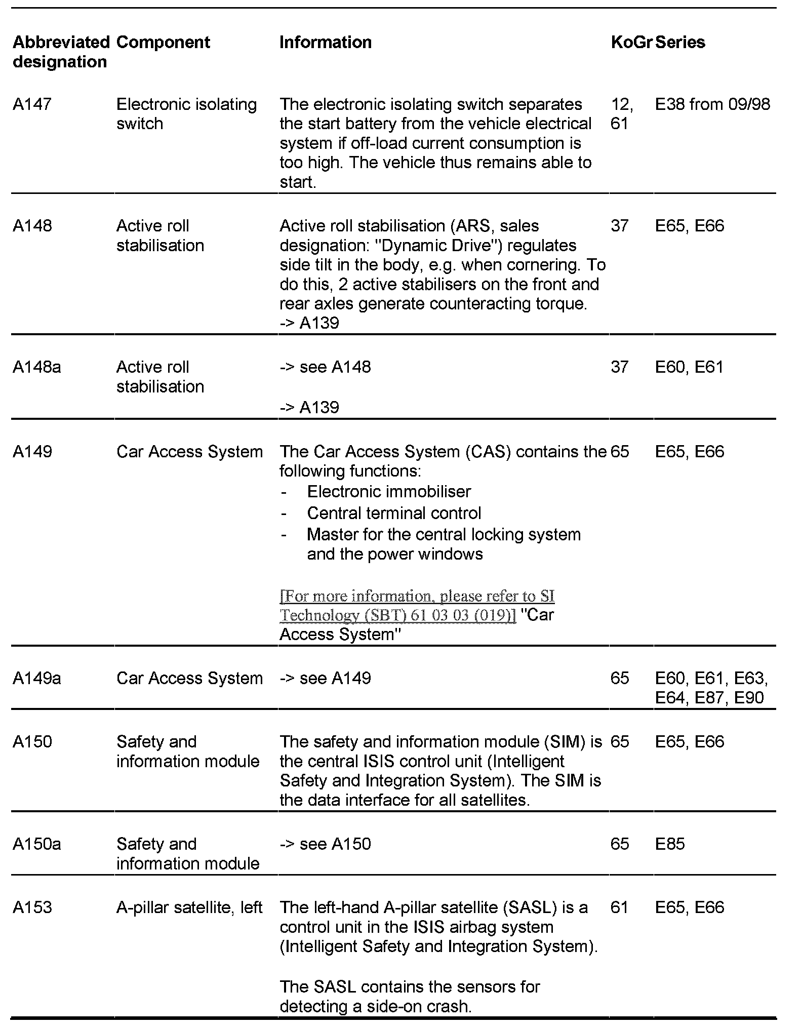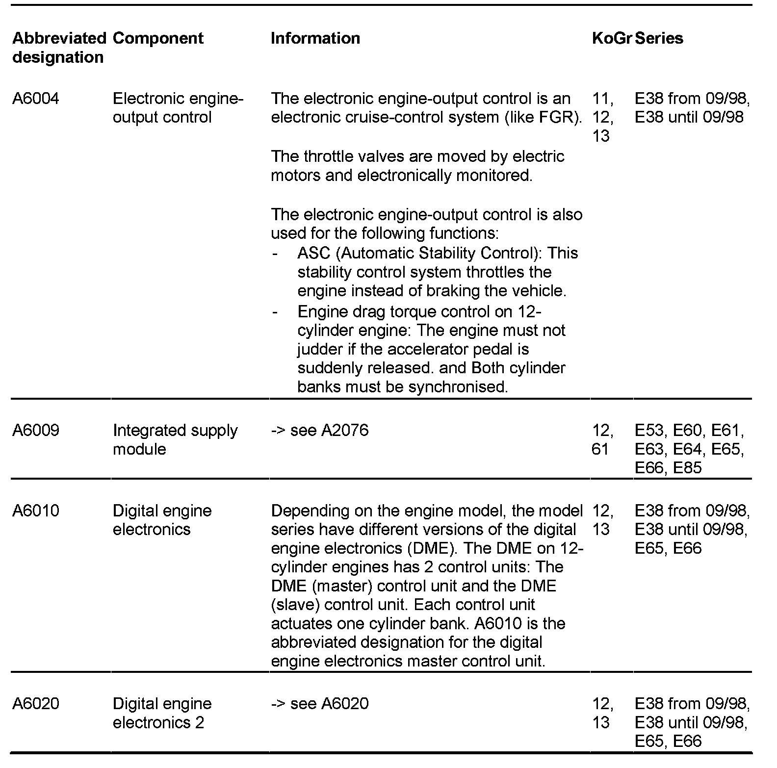 This list contains all BMW control units with the abbreviated designation "A..." (regardless of whether or not the control units concerned appear in the quick test or in programming).