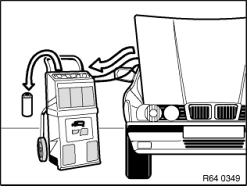 After evacuation, the refrigerant must be filtered in the service station as the oil separator could still contain a liquid refrigerant/oil mixture. The cleaning operation gasifies the refrigerant completely and only the previously bound refrigerant fluid remains in the oil separator. Measure and note down this quantity of refrigerant fluid.