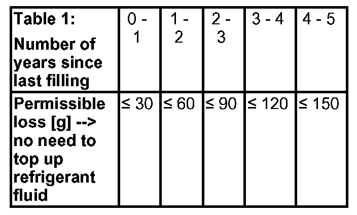 Table 1 indicates the permitted loss of refrigerant after a specific period of time. There is no leak. Refrigerant fluid may not be topped up.