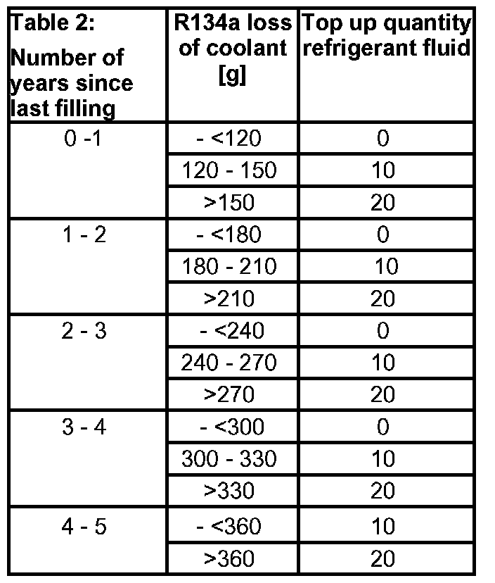 Table 2 indicates the amount of refrigerant fluid must be topped up with an unapproved loss of refrigerant due to a leak after a specific period of time.
