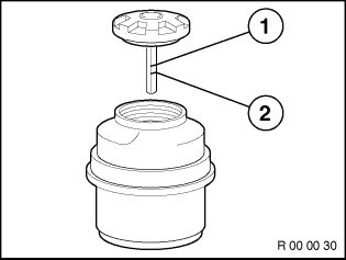 If the fluid level has dropped to the Min. marking (2), you must check the power steering and ride-height control for leaks and issue a separate invoice for this work.