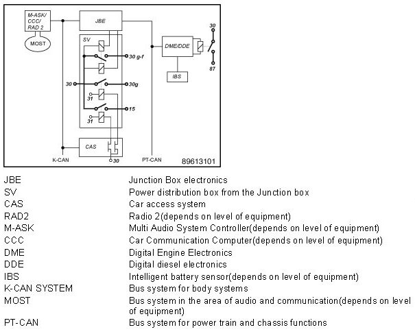 1. If an IBS is fitted, the power management in the DME/DDE monitors the standby current and the battery condition. If the battery charge state is close to the starting capability limit, the vehicle is wakened and a message to reset or shut down closed-circuit current cutoff relay is sent. The JBE regulates the bi-stable relay accordingly.