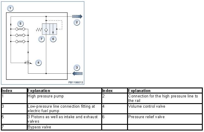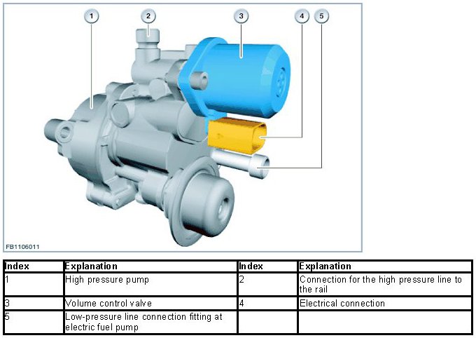 The volume control valve controls the fuel delivery pressure in the rail. The volume control valve is activated via a pulse-modulated signal (PWM signal) from the DME control unit. The PWM signal determines the throttle opening while also adjusting the fuel supply to provide the correct delivery rate for the engine's current load factor. In addition, there is the possibility to reduce the pressure in the rail. When a defect such as failure of a rail-pressure sensor is diagnosed in the system, electrical power to the flow-control valve is deactivated. The fuel then reaches the rail via a so-called bypass valve.
