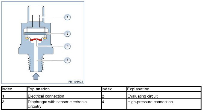 The signal from the rail-pressure sensor is an important input signal of the DME for activation of the volume control valve (component of the high-pressure pump). If the rail-pressure sensor fails, the volume control valve is activated in emergency operation by the DME.