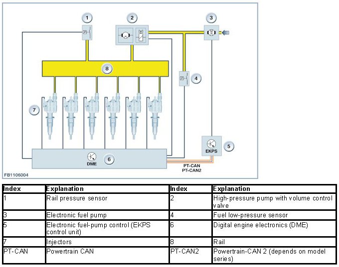 The DME control unit runs a continuous comparison between the specified pressure and actual pressure. If there is a deviation between the specified pressure and actual pressure, the DME control unit increases or decreases the voltage for the electric fuel pump, sent as a message across the PT-CAN to the EKP control unit. The EKP control unit converts the message into an output voltage for the electric fuel pump. These regulates the required delivery pressure for the engine (or high-pressure pump).