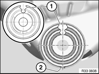 Draw rubber mount into rear axle support so that slot (1), rubber mount center point and notch (2) form a line.