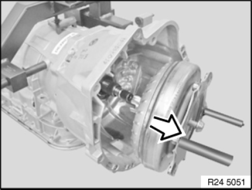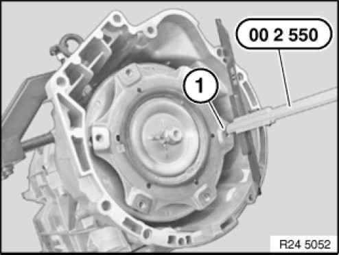 Press torque converter by hand into converter housing and turn in the process. Converter hub recess must snap into place in driver of pump impeller. Torque converter must be felt to slip inwards.