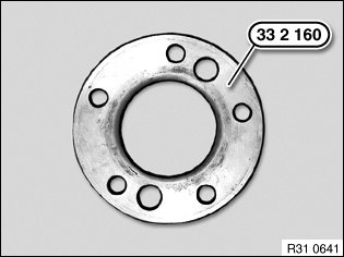 Screw on special tools 33 2 203, 33 2 207 and 33 2 201 with all wheel bolts to drive flange.