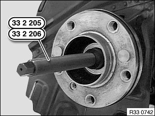 Draw in output shaft with special tool 33 2 205 up to stop; in so doing, grip basic body 33 2 201 with special tools 33 2 202 and 33 5 070.
