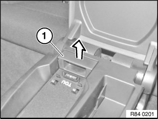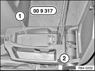 Lift eject box (1) with special tool 00 9 317 out of centre armrest.