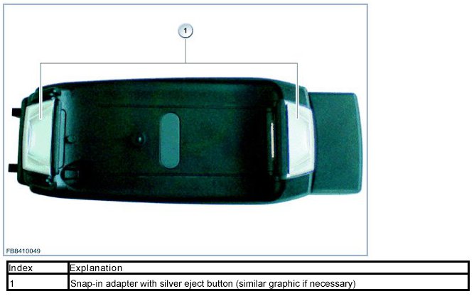 The respective snap-in adapter for BMW vehicles can be found in the Electronic Parts Catalogue (EPC). A snap-in adapter which supports the video function can be detected on the silver eject button (see graphic).
