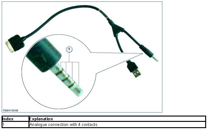 The MINI Y-cable has a connection for the Apple terminal device and a USB port and a 4-pin analog jack plug. The data exchange and the audio signals are transmitted via the USB port. The video signal is output analogously via the jack plug. From production date 03/11 the sterio-audio signal is also transmitted analogously via the jack plug.