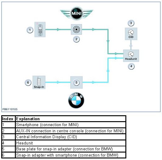This functional description must be used for BMW and MINI vehicles. The function is identical for both brands. Only the smartphone connection is different. The video connection for the BMW is integrated in the base plate and must be connected with the smartphone via a corresponding snap-in adapter. For the MINI the smartphone is connected via a special MINI Y-cable to the USB and AUX-IN connection in the centre console.