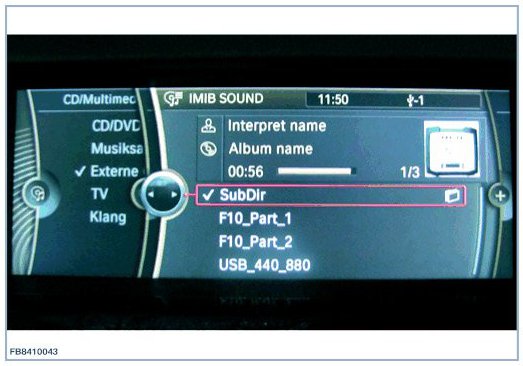 IMIB SOUND must be selected via the controller in order to display and play the music files. Check volume control in vehicle. A total of 3 media files and a sub-directory (SUBDIR) with contents are offered. To find the subdirectory, select IMIB SOUND and then select Browse directories. In vehicle with a Combox, album cover information is displayed in the form of a graphic as well as the media descriptions (genre, album and track).