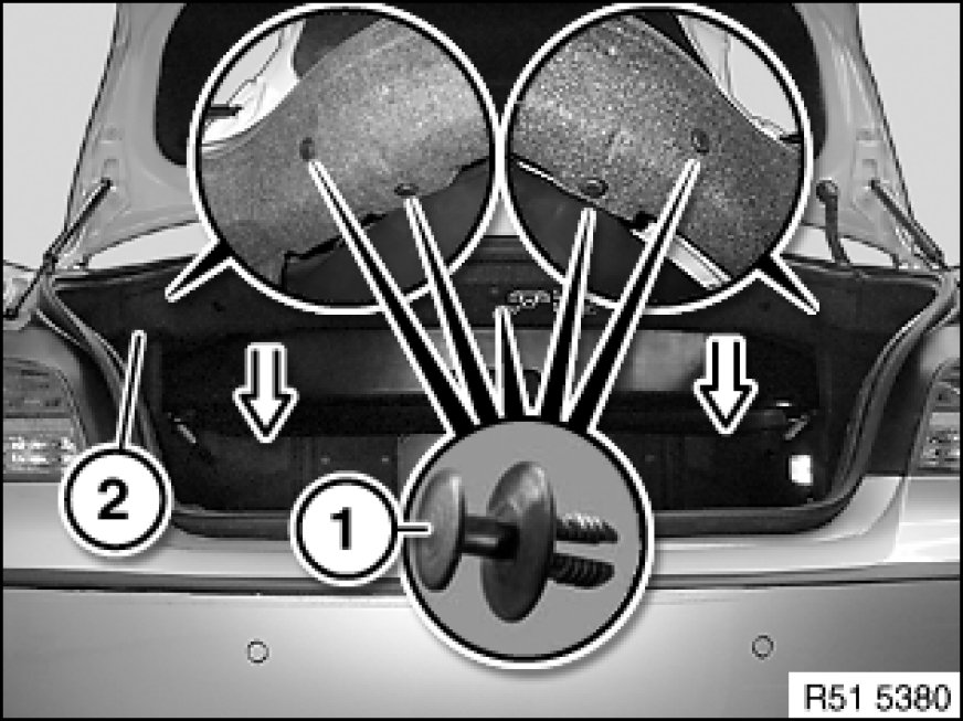 Release expander rivets (1) and remove luggage compartment trim panel (2) towards bottom.