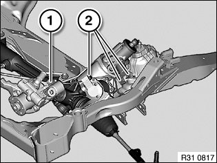 Disconnect plug connections (1) and unclip connecting line (2) from front axle support.