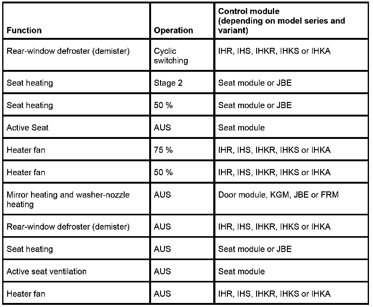 In order to prevent excessive power consumption when the engine is switched off, on these vehicles the seat heating, mirror heating, washer-nozzle heating and heated rear window are switched off and the heater blower is reduced to 75 % power consumption. The displays remain active (LEDs still lit).