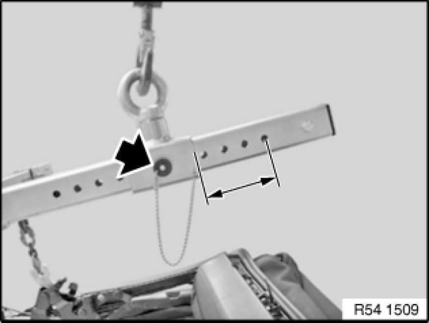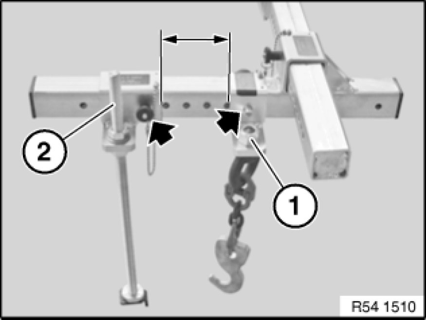 Use lifting gear and assembly carrier only in conjunction with BMW WJN.10 workshop crane (special lifting arm with 1690 mm arm length) or a crane with comparable specifications.
