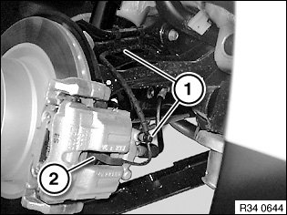 Make sure holders (1) and brake pad wear sensor (2) are correctly seated in brake caliper.