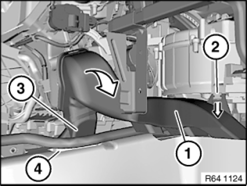 Detach left footwell heating duct (1) with adapter (3) from heating and air-conditioning unit and remove in direction of arrow from left rear compartment heating duct (4).