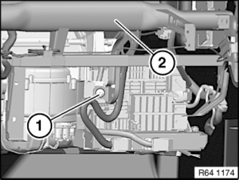 Effective 09/2009, vehicles with SA 606 (Navigation Business) or SA 609 (Navigation Professional) will no longer have vent hose (1) on heater (2). In addition, vehicles manufactured up to 09/2009 will no longer require vent hose (1) for parts replacement.