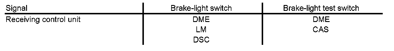 In contrast to the other control units, the two signals of the brake-light switch are simultaneously evaluated in the DME. This direct comparison of the two signals makes it possible to establish definitely whether the brake pedal is being operated. Furthermore, a malfunction of the brake-light switch can also be diagnosed. In addition, the function is still possible if one of the signals fails.