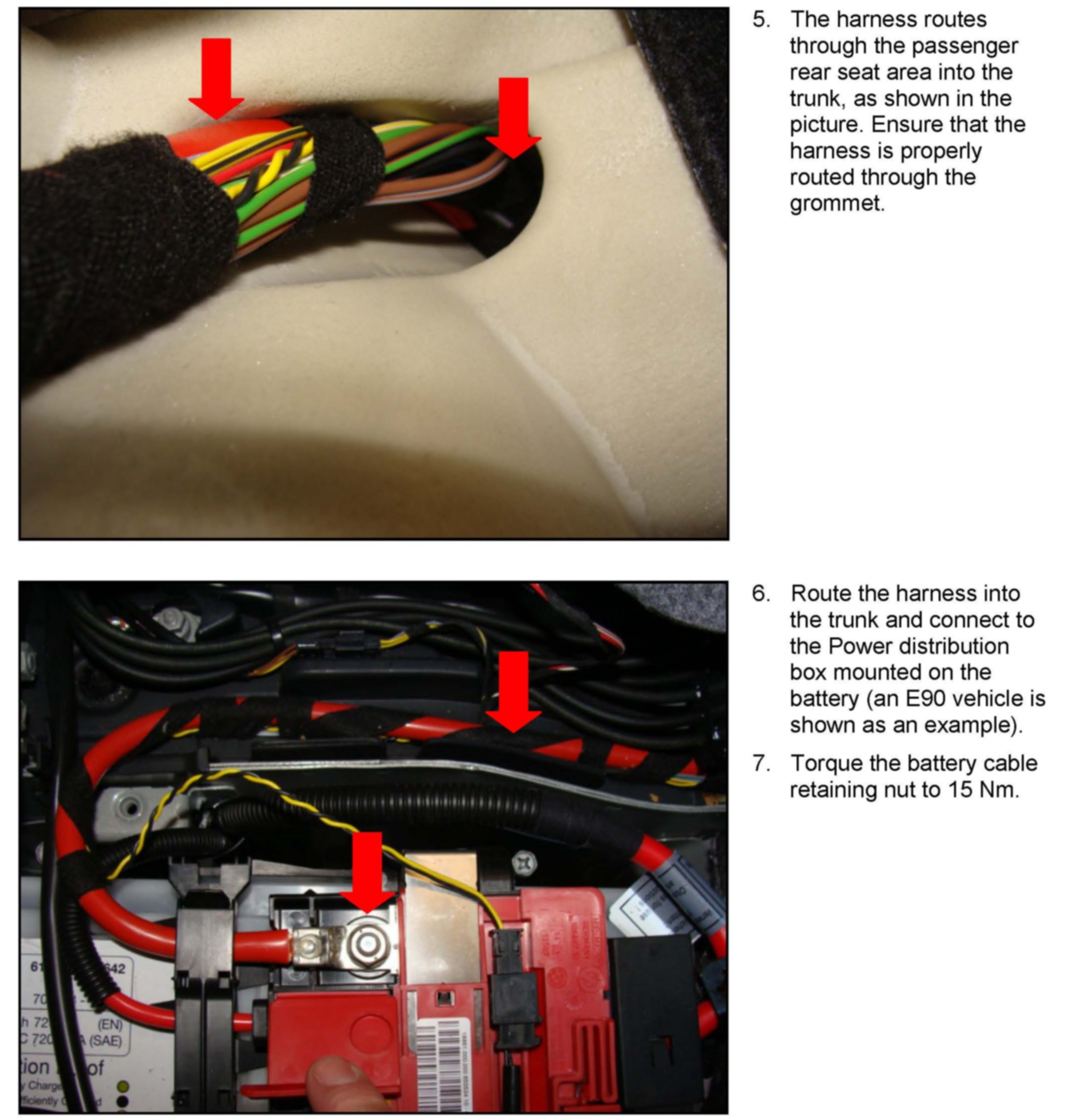 3. If discoloration is noted in the affected area, replace both the fuse box and the cable. The cable routes from the battery fuse box in the luggage compartment to the front fuse box along the main wiring harness, under the carpet on the right side of the vehicle interior. There are currently no repair instructions to replace this cable. Refer to ISTA Repair Instructions REP 51 47 315 and 51 47 440 for removing all the carpets in order to gain access to the harness. Route the new cable in the exact same way as the original cable. Refer to attachment.